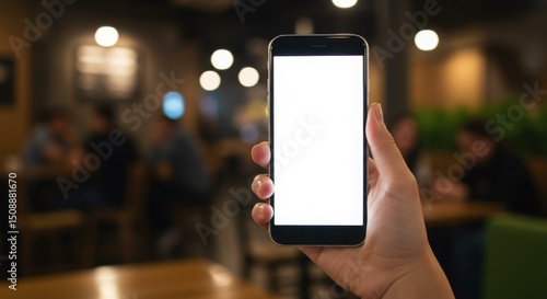 Hand holding smartphone with blank screen in blurred restaurant setting