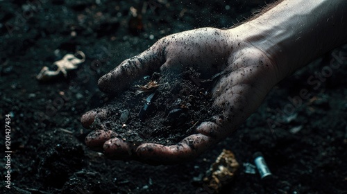 hand, dirtied, debris, pollution, environment, waste, earth, management, symbolic, recycling, impact, preservation, nature, awareness, dirt, ecology, sustainability