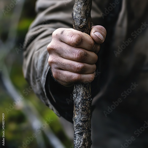hand, holding, stick, gripping, grip, trunk, tree branch, wood, nature, person, closeup, detail, human, male, rough, tough, survival, forest, texture, worn, earthy, organic, natural, rural, simplicity, material, strength, support, walking, adventure, travel, explore, clothing, background, path, outdoors, plant, lifestyle, determination