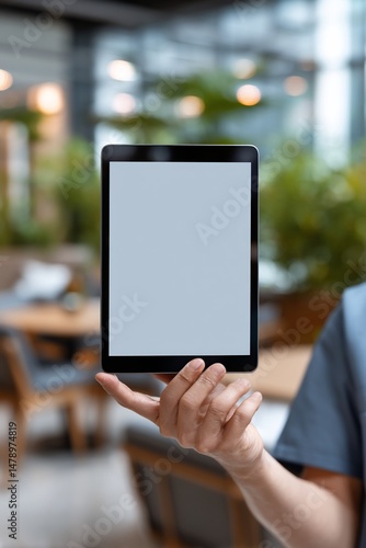 tablet, screen, blank, hand, cafes, hold, display, digital, technology, modern, device, pointing, showing, empty, presentation, business, eatery, interior, blurred, background, light, green, plant, wooden, table, chair, finger, product, demo, showcase, promotion, marketing, retail, commerce, client