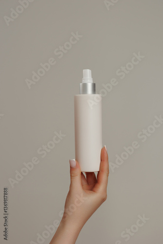 Hand holds a cosmetic bottle against a neutral background in soft lighting