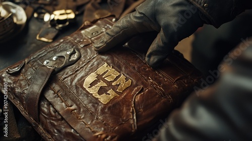 hand, glove, black, leather, bound, book, gold, insignia, detail, texture, surface, worn, antique, vintage, old, rustic, weathered, faded, cracked, dark, mysterious, secret, treasure, hidden, story, history, symbol, emblem, craftsmanship, quality, mystery