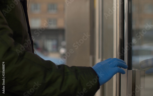 glove, protection, virus, man, health care, hand, infection, pandemic, epidemic, medicals, prevention, medicine, protective, safety, wearing, city, person, sick, danger, biohazard, environment, social, problem, male, adult, concept, disease, protect, subway, subway, door, opening, transport, public, closeup, closeup