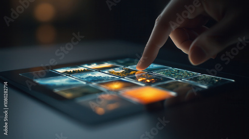 hand interacting with digital tablet displaying gallery of images, showcasing serene landscapes and vibrant colors. ambient light enhances tranquil atmosphere