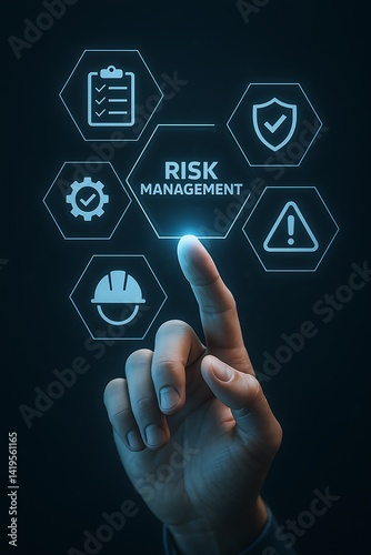 Hand interacting with futuristic digital icons representing risk management and safety