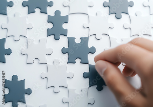Hand is placing puzzle piece into larger puzzle made of gray and white pieces, symbolizing problem solving and creativity. image captures essence of teamwork and collaboration
