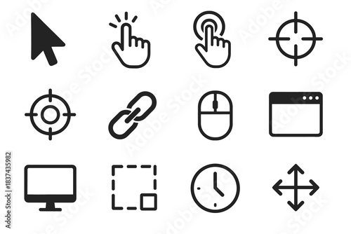 vector, icon, target, cursor, hand, selection, mouse, link, tap, click, window, screen, clock, arrow, box, drag, symbol, simple, design, clean, collection, minimal, flat, outline, trendy, set, modern, graphic