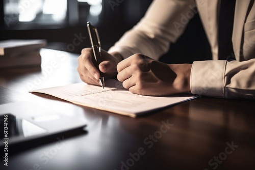 document, signature, business, group, contract, hand, lawyer, businessman, office, man, professional, businessperson, legal, conference, light, pen, writing, working, note, sunset, closeup, deal, executive, day, signs, concept, team, finance, work, agreements, person, paperwork, lifestyle, meeting, male, form, career, signing, generative, ai