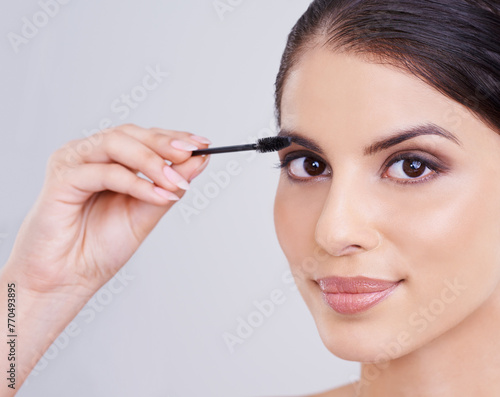 Hand, mascara and brush with woman in portrait, beauty for lashes and cosmetology on white background. Makeup, glow and transformation for makeover, cosmetic product and wand for eyelash with volume