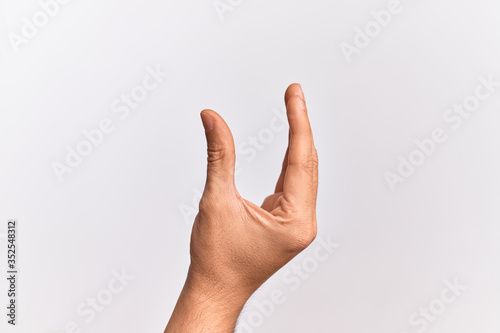 Hand of caucasian young man showing fingers over isolated white background picking and taking invisible thing, holding object with fingers showing space