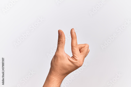 Hand of caucasian young man showing fingers over isolated white background picking and taking invisible thing, holding object with fingers showing space