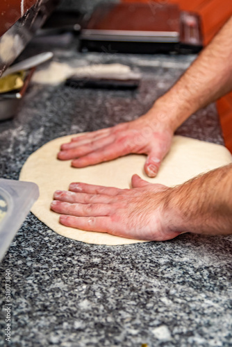 hand of chef baker making pizza at kitchen. The process of making pizza. cooking italian pizza