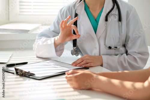 Hand of doctor reassuring her female patient and showing ok sign. Medical ethics and trust concept