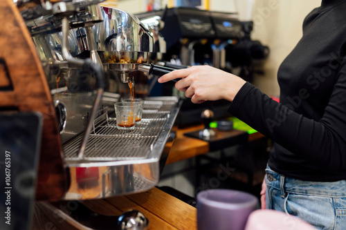 Hand of female barista making a coffee in a coffee shop close up