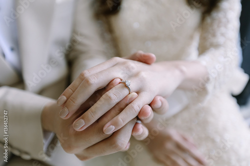 Hand of lover are wearing a ring on her wedding day