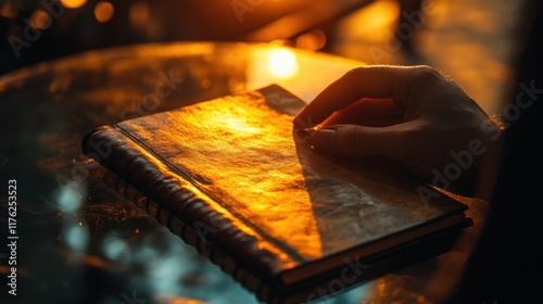 Hand on Leather Journal with Sunlight Reflection at Golden Hour