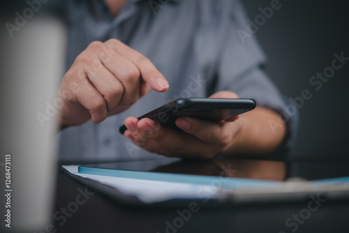 Hand operating cellphone at workplace desk, business lifestyle. Modern office worker using mobile technology, professional environment capture with documents."