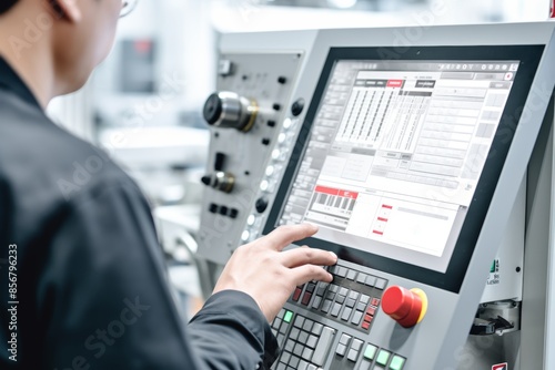 Hand operating cnc machine control panel for precise data input and control demonstration
