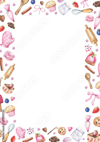 Hand painted in watercolor frame with kitchen items, cake, pastry. High quality illustration