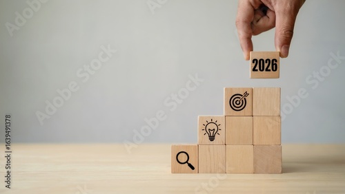 Hand placing 2026 block on wooden cubes representing goals, ideas, and vision for success