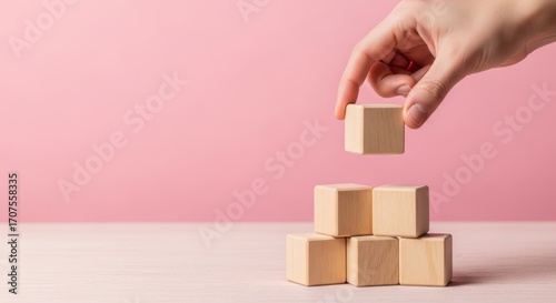 hand, wooden, block, stack, pink, background, cube, building, toy, arrangement, minimal, concept, growth, development, structure, design, element, shape, beige, pastel, surface, table, studio, shot, closeup, copy space, topview, business, strategy, planning, organisation, success, leadership, teamwork, progress, innovation, creativity, simplicity, geometric, construction, balance, stability