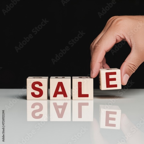 Hand placing final letter cube to spell SALE, announcing exciting deals and promotions for shoppers