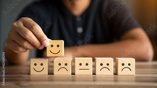 “Hand Placing Happy Face Block Among Emotional Expressions – Feedback, Mood Selection, and UX Psychology Concept”
