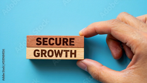 growth, secure, business, finance, investment, strategy, concept, idea, progress, development, stability, success, planning, management, wooden blocks, text, word, hand, finger, holding, placing, building, foundation, future, economy, achieve, goal, objective, positive, optimism, blue background, clean, minimalist, studio shot, closeup, symbolic, metaphor
