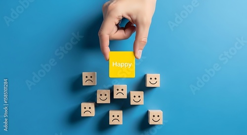 Hand Placing Yellow Happy Block Among Neutral and Sad Faces