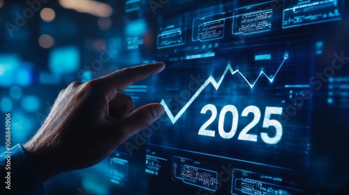 Hand pointing at a screen with a graph showing a positive trend for 2025.