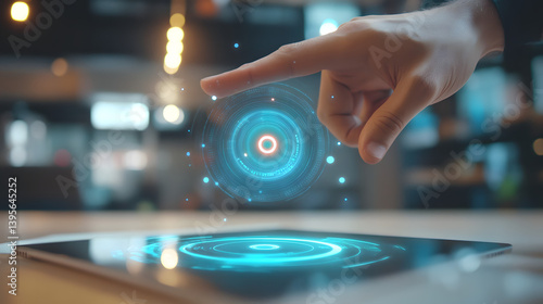 Hand Pointing to Holographic Target Icon Above Tablet in Creative Agency Office