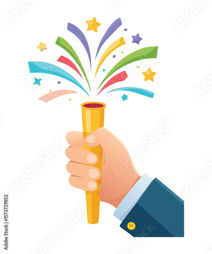 illustration, hand, holding, confetti, popper, star, explosion, burst, celebration, festive, party, happy, event, joy, fun, vibrant, colourful, entertainment, isolated, success, excitement, new year, birthday, holiday, cartoon