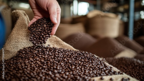 hot drink, bean, roasted, burlap, sack, hand, pouring, brown, agriculture, caffeine, aroma, beverage, closeup, dark, fresh, harvest, industry, natural, organic, production, rural