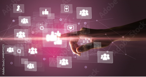 Hand pressing social media multimedia application screen with media icons on futuristic concept