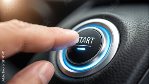 hand pressing start button vehicle, symbolizing ignition process and modern technology. button features sleek design with glowing outline
