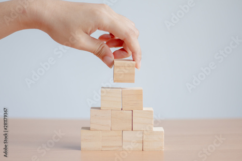 Hand putting wood cube on top of wood block stacking as step stair.business growth to success.