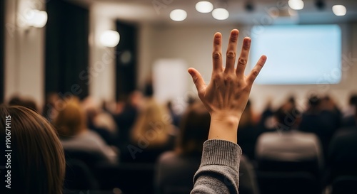 hand, raised, audience, presentation, meeting, conference, room, people, blurry, background, screen, projector, light, ceiling, whiteboard, chair, seat, brown hair, sweater, grey, during, crowded, sharpened, while, wall, seated, chair, visible, atmosphere, setting, style, colours, pattern, visual, creative, media, motion, movement, cinematic