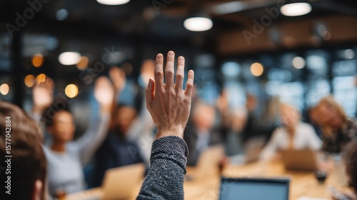 meeting, hand, raised, vote, business, team, conference, collaboration, decision, participation, agreements, support, choice, cooperation, people, discussion, seminar, group, office, workplace, diverse, equality, inclusion, communication, opportunity, opinion, view, feedback, audience, forum, dialogue, suggestion, strategy, planning, brainstorming, development, leadership, engagement, involvement, diversity, success, idea, sharing, listening, understanding, respect, consent, approval, solidarity