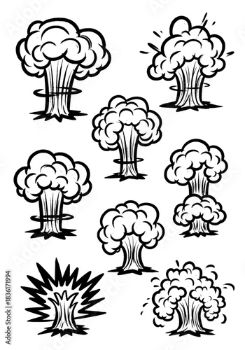 Hand sketched black and white mushroom clouds, explosive comic book blast icons, various shapes representing atomic power and impact