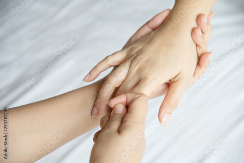 Hand spa massage over clean white bed background - people relax with hand massage service