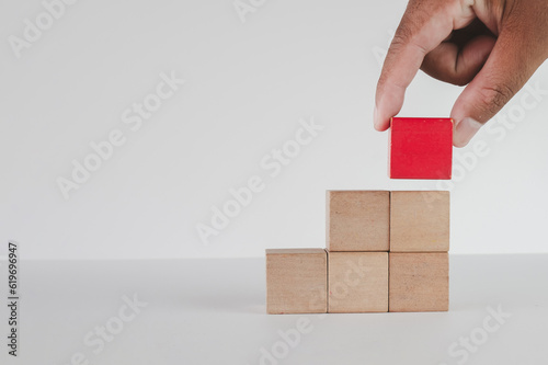 Hand stacking red wooden cube as step stair on table with copy space for put text,word,logo or infographic icon perfect for flat lay top view mock-up item,business concept.