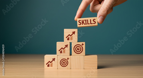 Hand Stacking Wooden Blocks with Skills Text and Growth Icons on Table Against Blue Background