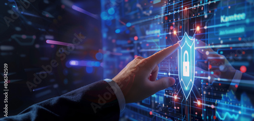 hand touching digital data with futuristic hologram and colorful spiral vortex background, technology concept. Digital twin of abstract connection in the cyberspace