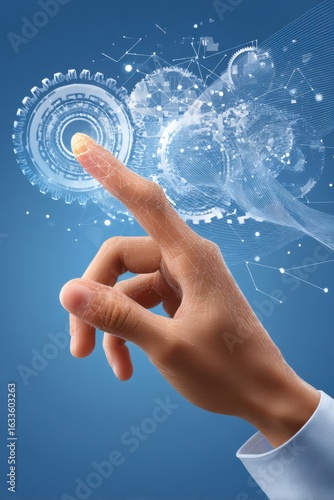 technology, innovation, progress, business, digital, future, gear, hand, touch, interact, interaction, connectivity, science, automation, network, advanced, cyber, design, concept, vision, interface, high technology, process, motion, strategy, interactive, system, blue, electronic, efficiency, engineering, light, illustration, abstract, cybernetic, communication, glow, futuristic, datum, information, mechanism, symbol, development, software, precision, success, modernization, collaboration
