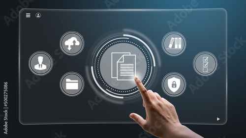 Hand touching document icon on virtual screen to document management, online documentation database and digital file storage system software, records keeping, database technology, doc sharing.