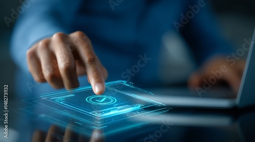 hand, touching, laptop, screen, glowing, green, checkmark, closeup, tech, interaction, light, blue, shirt, black, computer, digital, concept, modern, technology, interface, confirmation, success, graphic, circular, display, human, device, work, office, professional, communication, approval, symbol, innovation, touch, gesture, sharpened, detail, minimal, sleek, corporate, productivity, virtual, connection, contemporary