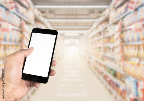 Hand using smartphone with blank screen on Blurred shelf in supermarket.