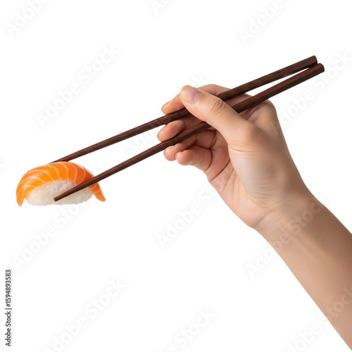hand with chopsticks picking up sushi nigiri on Isolated transparent background png. generated with AI