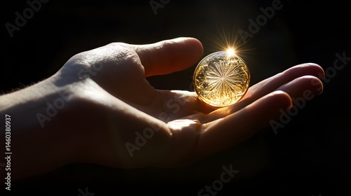 Hand with Medal Reflecting Light: A hand holding a shiny medal that reflects light, creating a starburst effect, with a simple, dark background.
