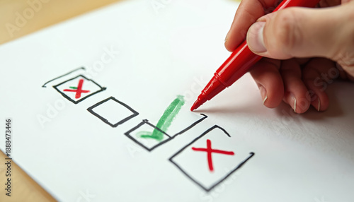 Hand with red marker ticks boxes on survey paper. Some ticks are green correct checks, some are red crosses. Making decisions choosing options. Task list completion.